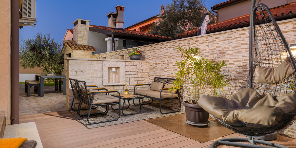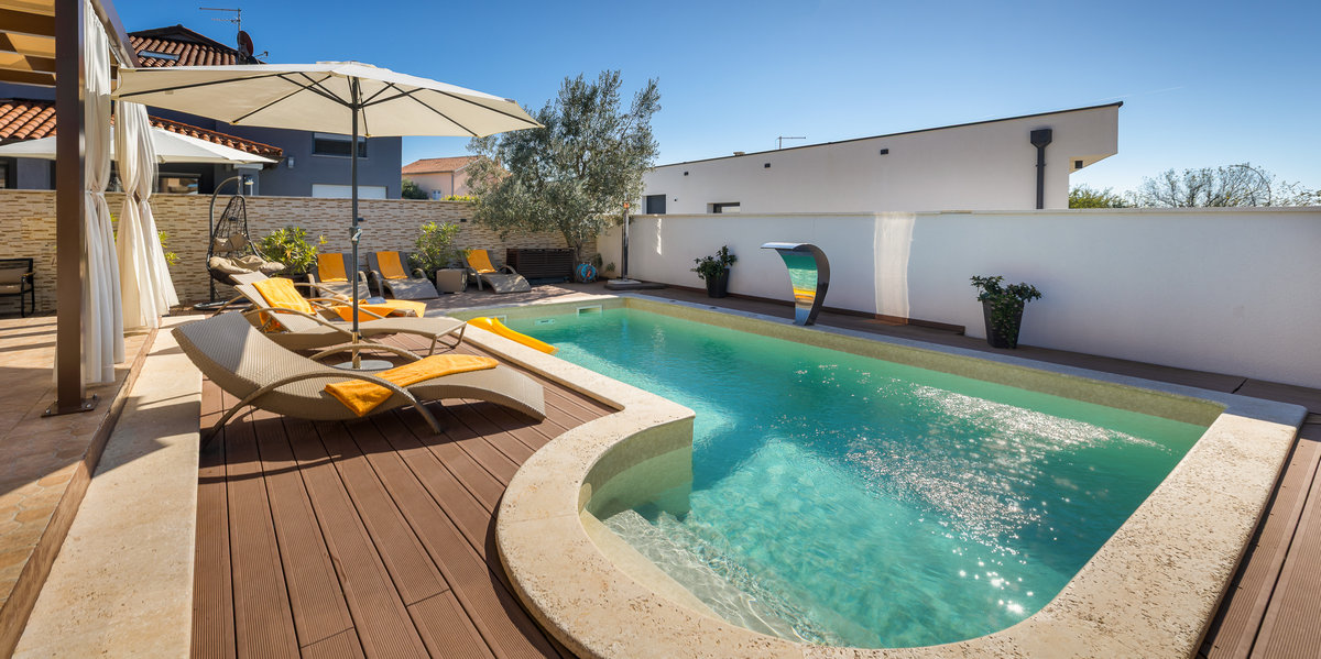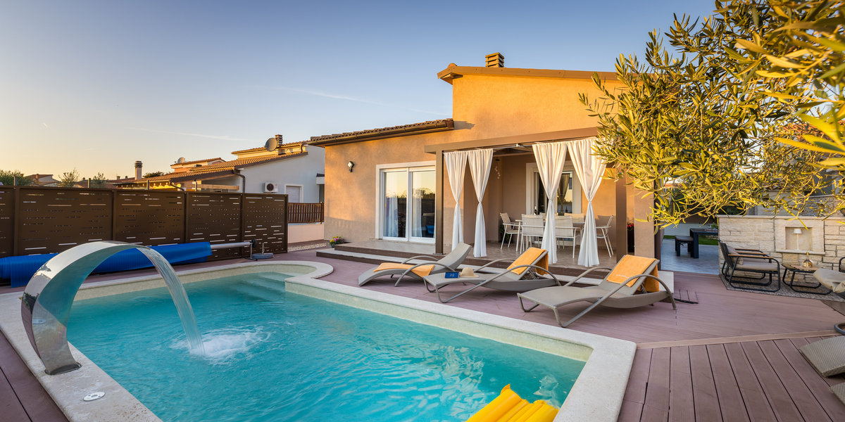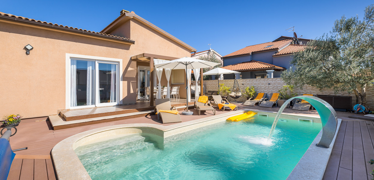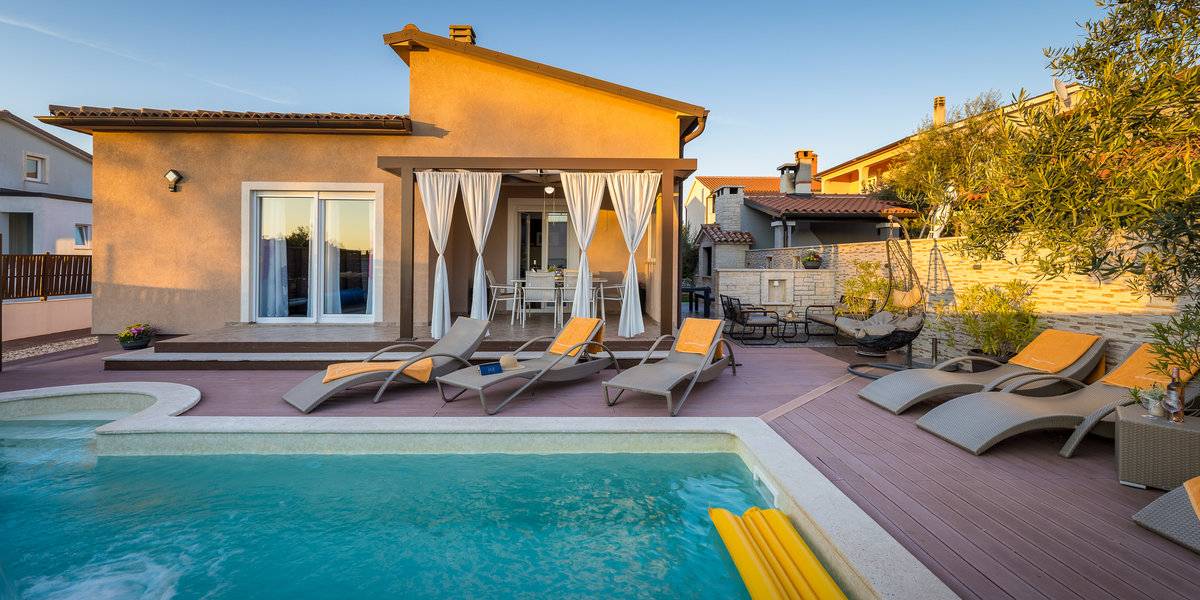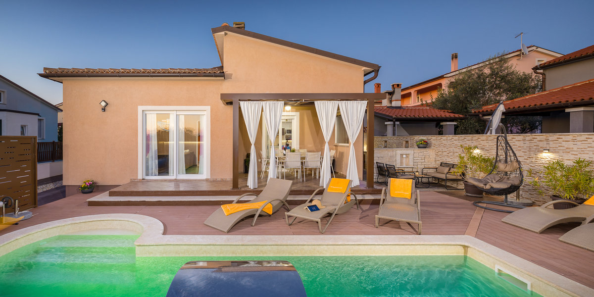 Ova novouređena kuća za odmor nalazi se u malom mjestu Škatari nadomak Pule. Moderno opremljeni interijeri prate standarde današnjeg načina življenja. Kuća ima tri spavaće sobe i idealna je za ugodan boravak veće obitelji sa djecom. Iz prostranog dnevnog dijela izlazi se na natkrivenu terasu na kojoj ćete uživati uz jutarnju kavicu ili lagano ljetno štivo. Sa terase se prilazi vanjskom bazenu koji raspolaže protustrujnim plivanjem kao i mlaznicama za masažu. U stražnjem dijelu kuće, na ograđenoj okućnici nalaze se tobogan, klackalica, vrtuljak, stolni nogomet te stol za stolni tenis, to će svakako priuštiti mnogo zabavnih trenutaka kako djeci tako i odraslima. Za sve one, koji i na odmoru žele ostati informirani na raspolaganju je bežični internet.